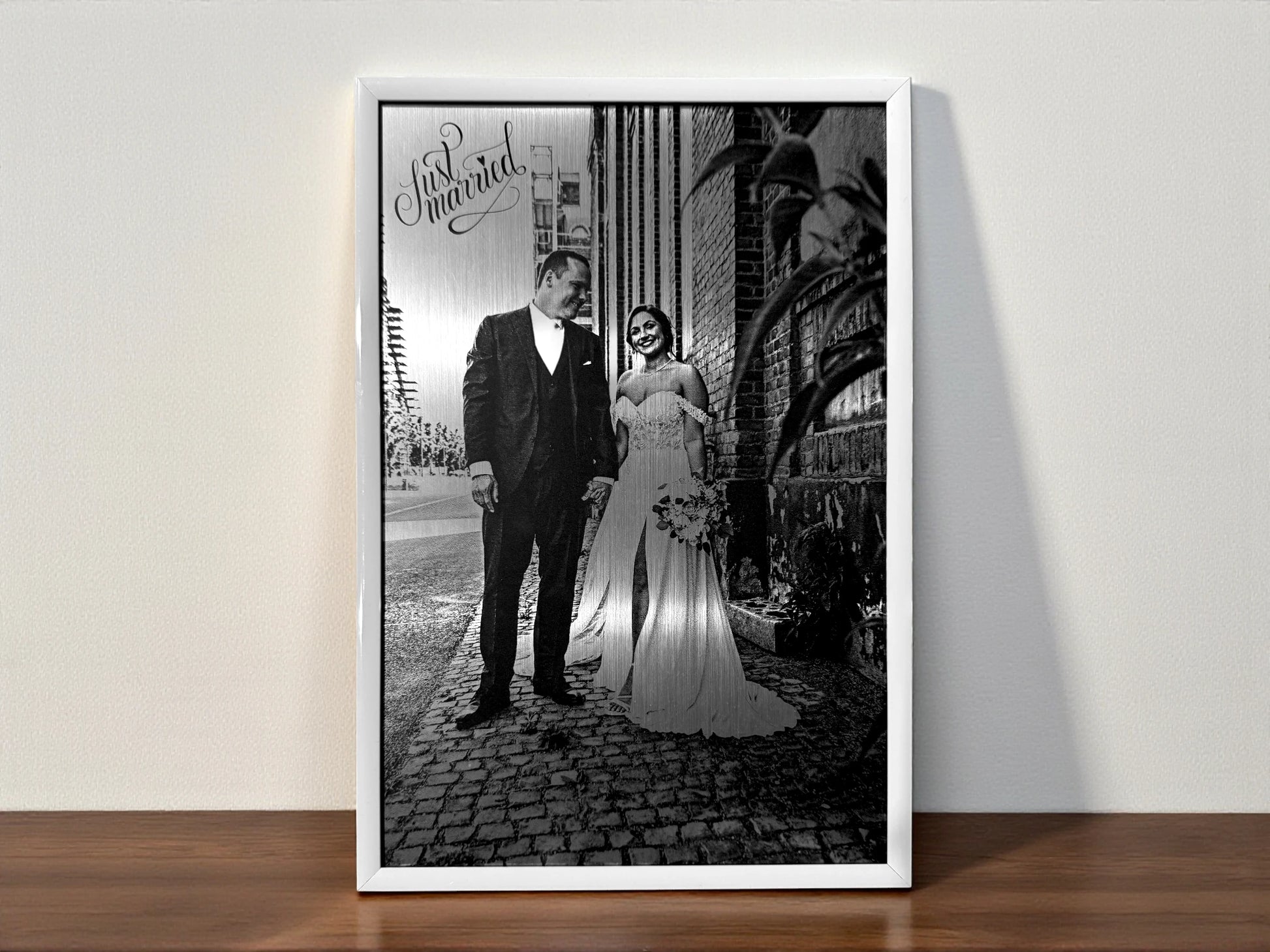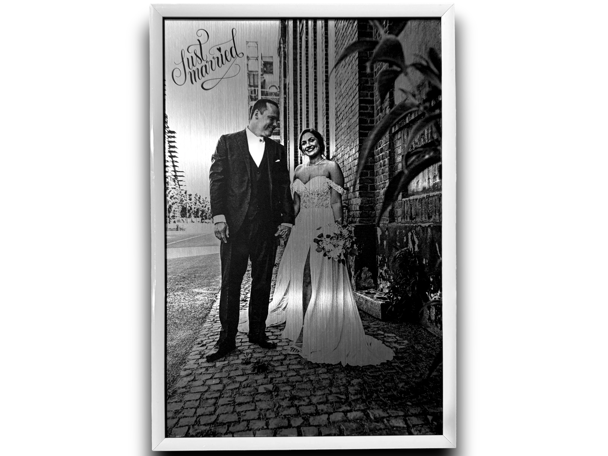 Lasergraviertes Foto in Metalloptik mit Bilderrahmen (Hochformat)